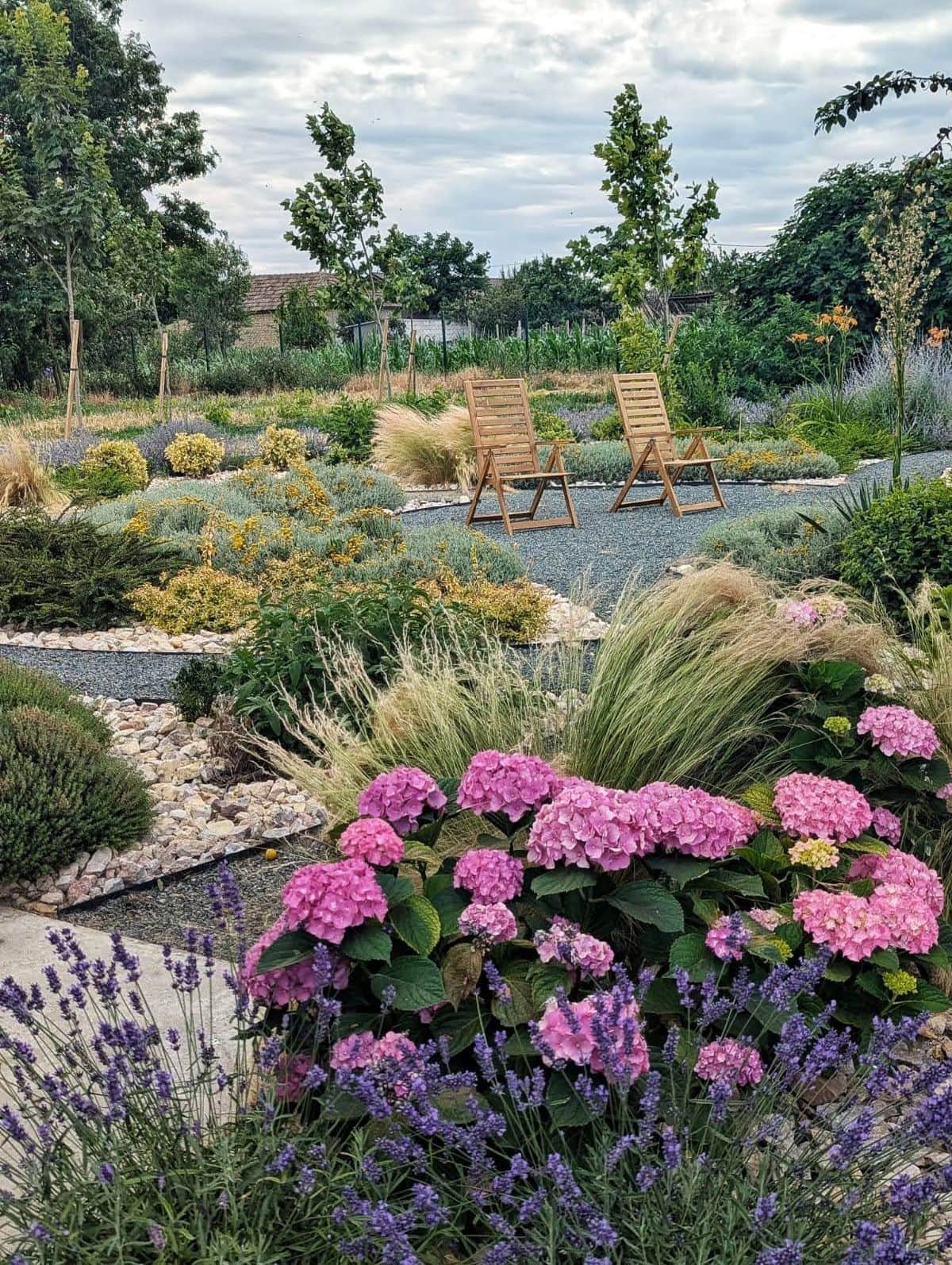 Amenajarea exterioară a inclus piatră, plante cu flori și arbuști decorativi
